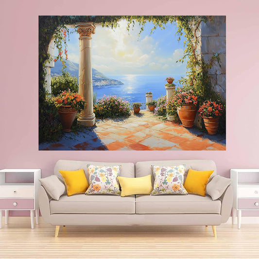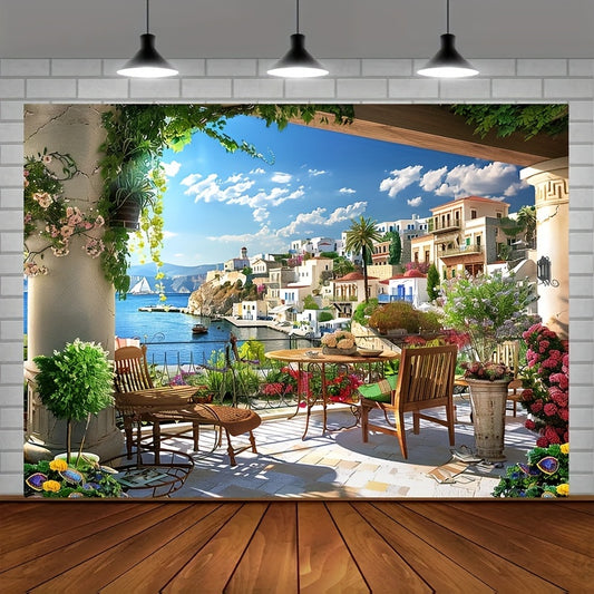 1pcs, Fabric Italian Photography Background Tuscany Garden Terrace Mediterranean Bay Coastal City Landscape Spring Flowers Roman Columns Italian Background Couple Adult Italian Photography Props
