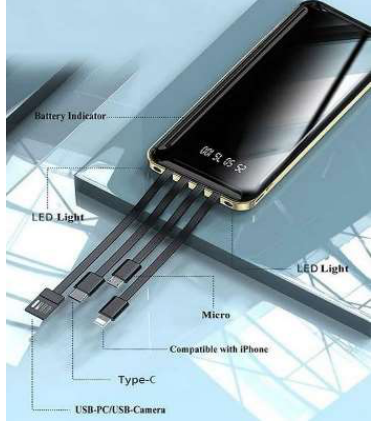 Power Bank 10000Mah Micro USB Type C & IOS Built-In Cables
