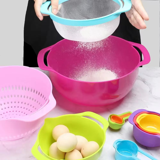 10pcs Stackable Rainbow Colorful Plastic Mixing Bowl Colander Washing Basket Mesh Sieve Measuring cup measuring spoon Bowl