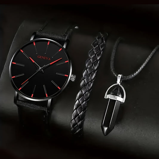 1pc Round Men's Quartz Watch & 1pc Bracelet & 1pc Necklace Set