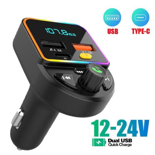 Car Bluetooth FM Transmitter PD Type-C Dual USB Fast Charger Ambient Light MP3 F