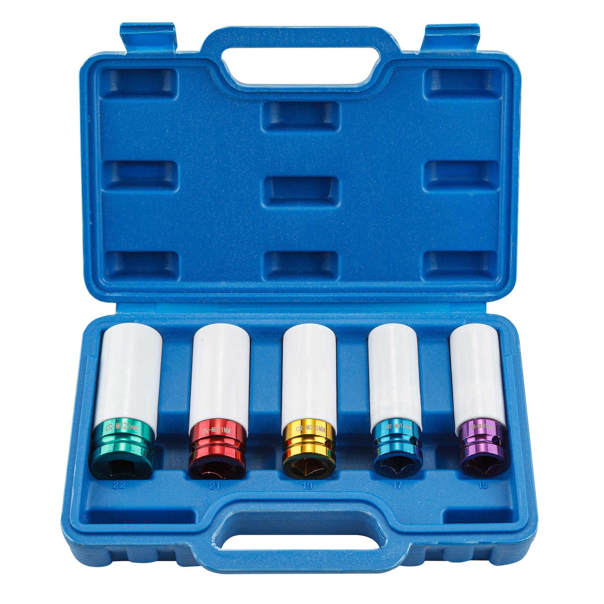 CARTMAN 5 Piece Set 1/2 Inch Drive Deep Impact Socket, Non-Marring Impact Lug Nut Socket with Protective Sleeves, CR-MO