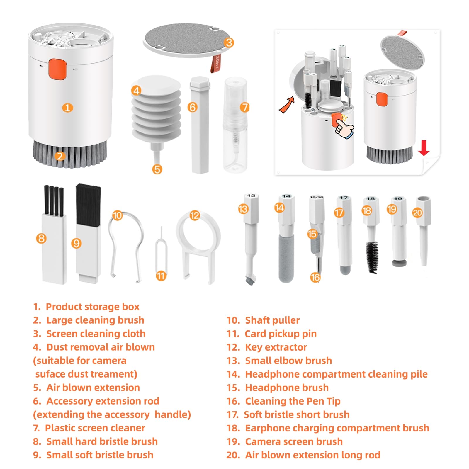 - 🚿【20-in-1 Keyboard Screen Cleaning Kit】: The computer cleaning kit includes retractable large brush, Airpod crevice cleaning pen, mini brush and flocked sponge brush, headphone case cleaning brush, charging port brush and camera screen brush, etc. (all of these brushes have extension rods for easier use). The cleaning kit also includes a screen cleaning cloth and spray, keycap extractor, shaft extractor, 2 extension poles, blower, dual brushes (hard and soft bristle), and a card removal pin.