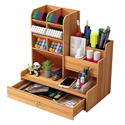 Wooden Desk Organiser DIY Desktop Tidy Pen Holder Large Capacity Stationery Storage Box with Drawer for Home, Office and School