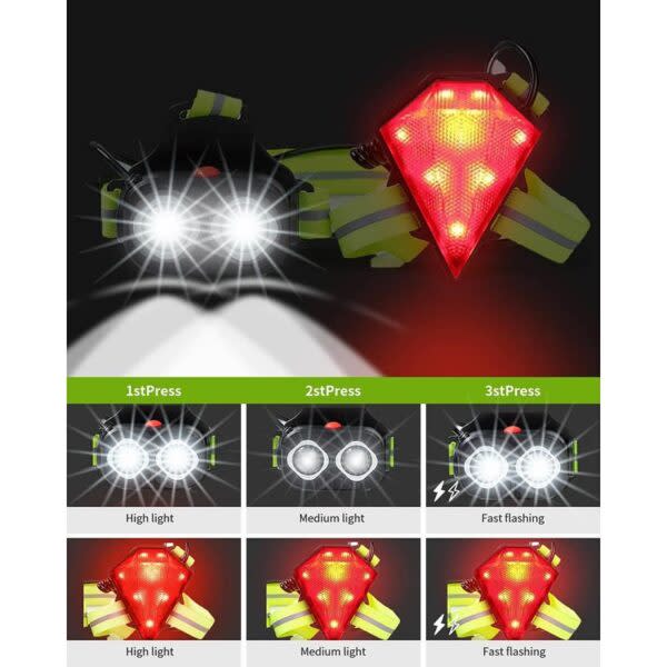-Red indicator on the back can warn the coming vehicles, help runners to be seen by drivers and avoid accidents in the dark, provide you with all-round protection. Features 3 lighting modes: high, low and strobe lights