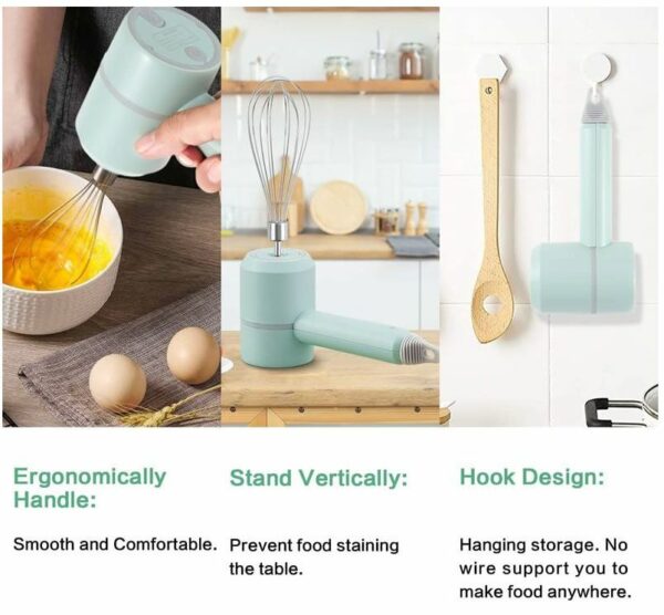 -The handle of this cordless portable cooking beater is ergonomically designed, smooth, and comfortable, and it is easy to touch the switch, start and stop at any time; Stand vertically designed to prevent food from staining the table; Hook Design, hanging storage, not occupying space, and easy to take