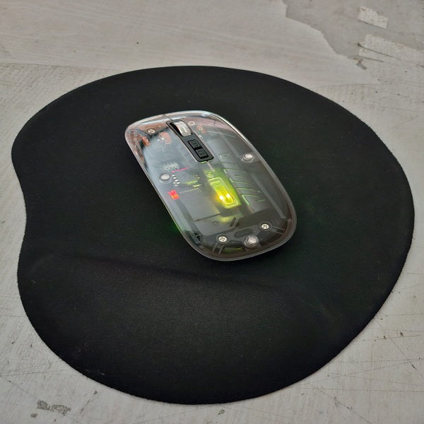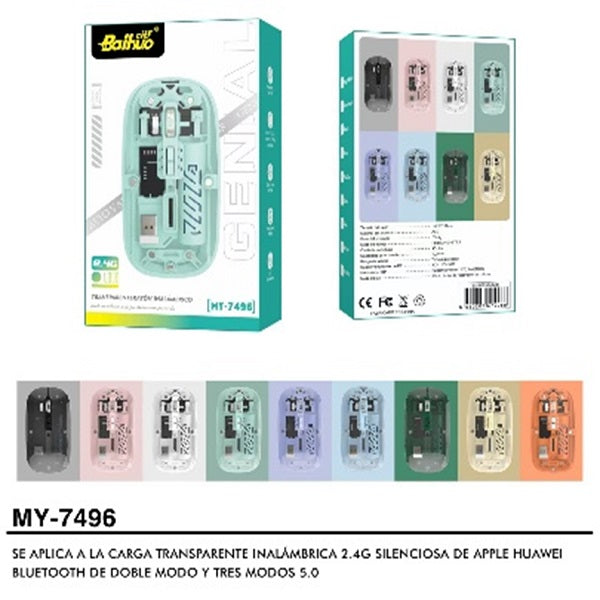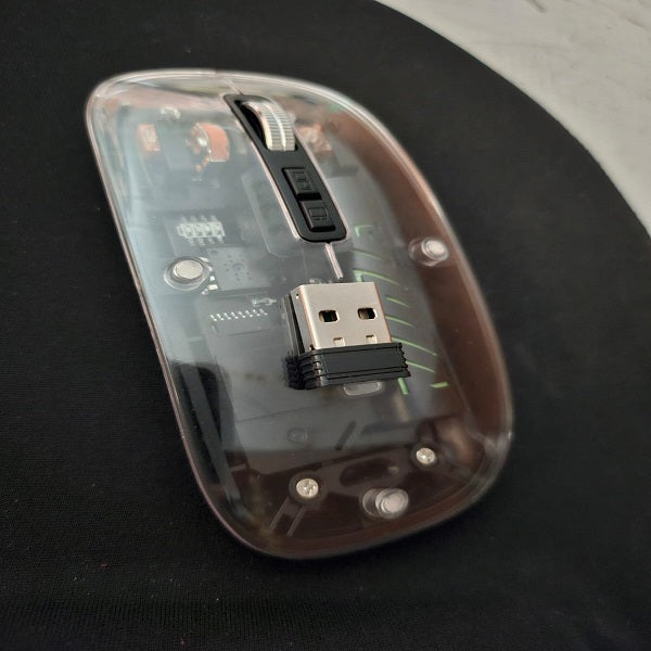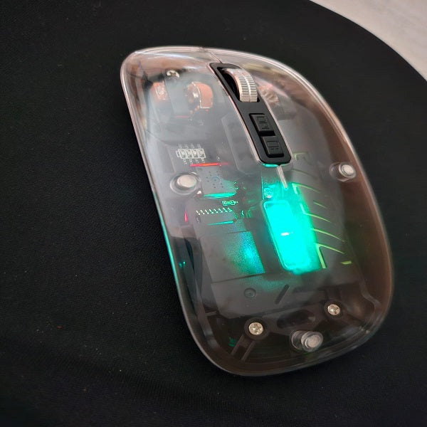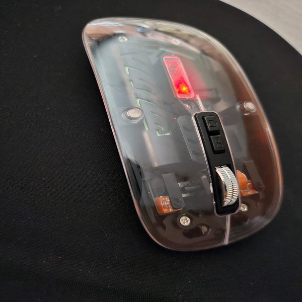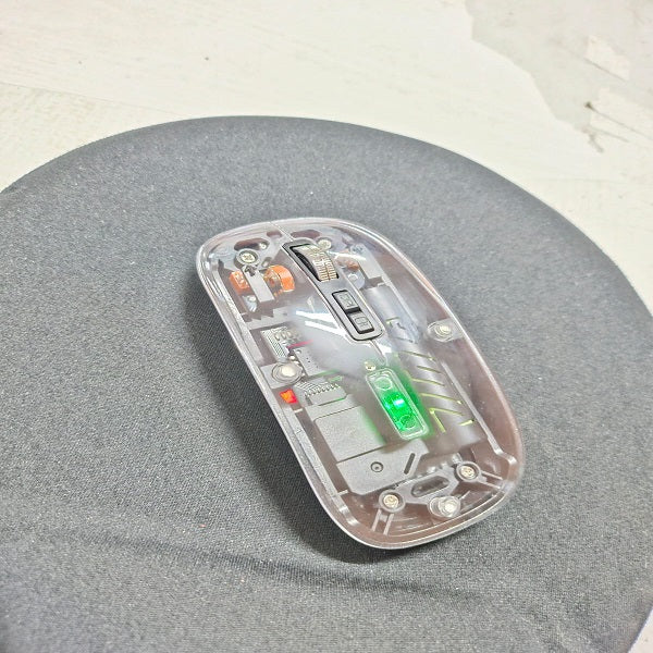This is the Baihuo MY-7496 Wireless Mouse, featuring a transparent shell that exposes its internal components