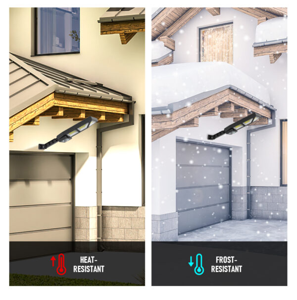 -Made of premium ABS and PC materials, solar street lights outdoor which is heatproof and IP65 waterproof, can withstand any extreme weather for a long time, such as rainstorm, snowstorm, frost or daily high temperature