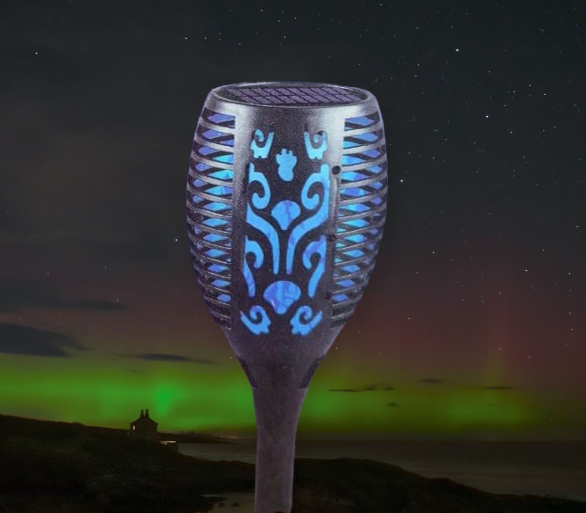 -This 12 LED blue solar lights outdoor decorative can be used as a street light to illuminate your house, garden, Yard, Patio, passageway. adding a wonderful and warm addition to your party, camping, barbecue, wedding, holiday gathering, etc. bonfire atmosphere.