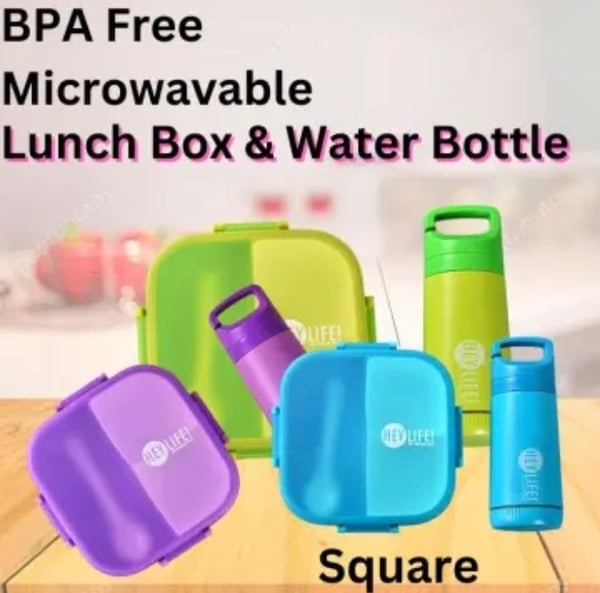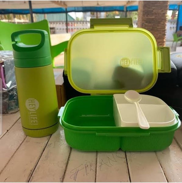 Lunch box with bottle and spoon, ideal for taking your food to the office, school, trips, gym or other activities.