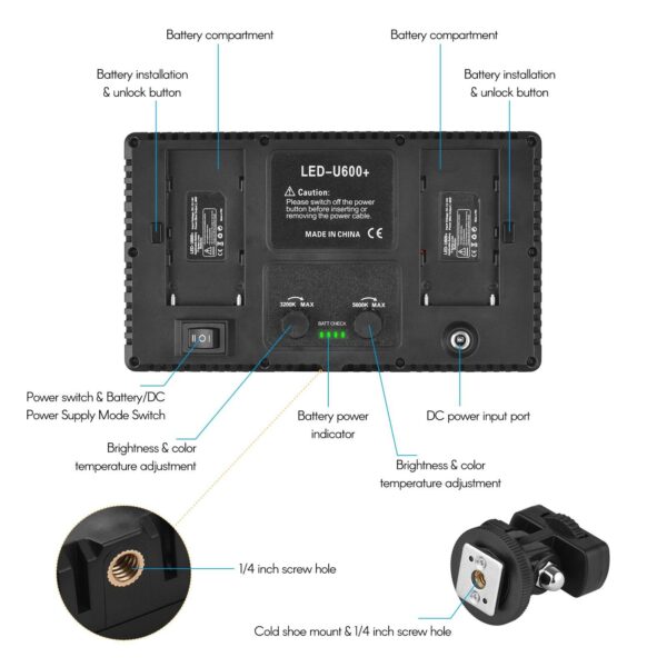 -Powered by external DC power input or 2 NP series batteries , no need for frequent plugging and charging; Battery indicator light, easy to know the remaining power and ready to change the battery