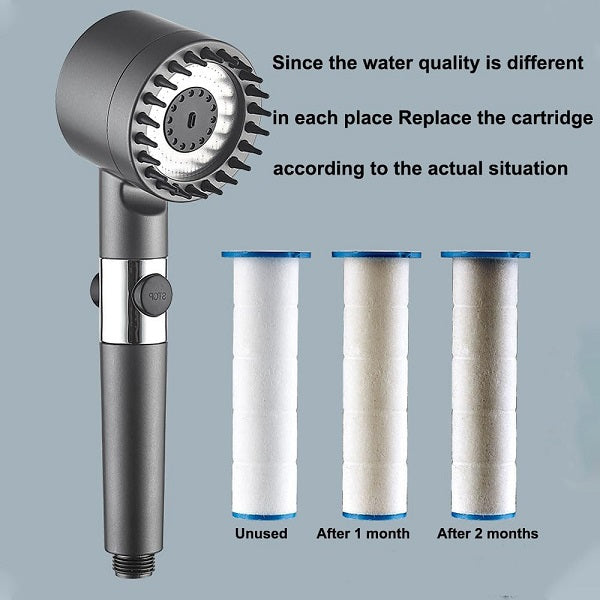 -Filter Cotton This filter shower head has a built-in filter with a replaceable cotton cartridge and a leak-proof seal at the bottom to prevent sand and dust from entering the shower