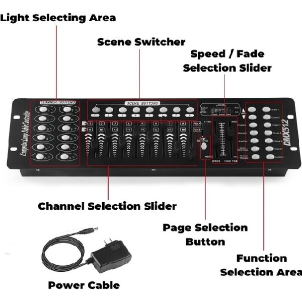 -Our DMX Controller is perfect for beginners.The DMX contains 7 sections, light selection area, scene switcher, channel selector lever, LED display, page selector buttons, speed/time selector lever, function selection area