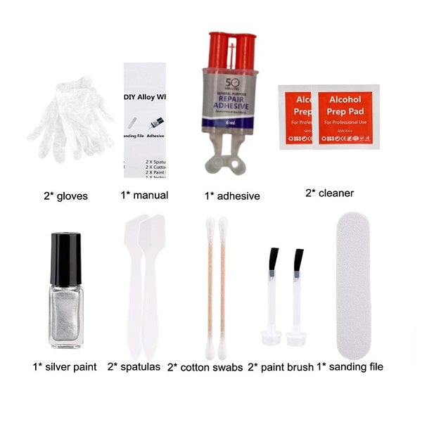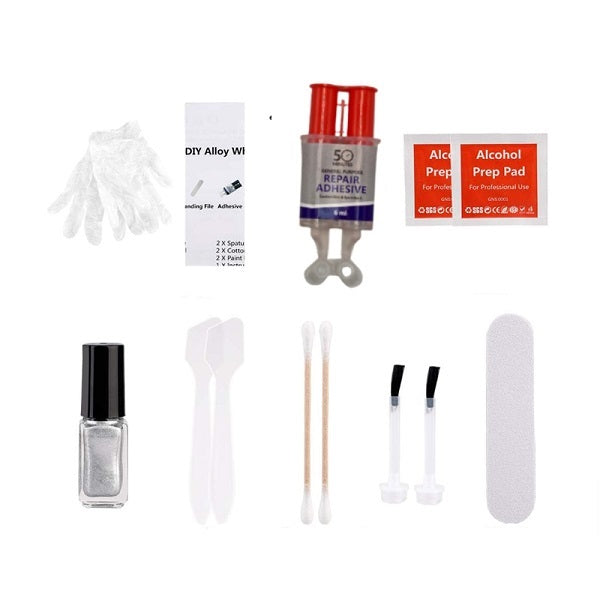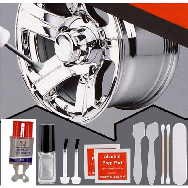 -The multifunctional wheel repair kit can be used for a wide variety of repair uses and applications; the kit is designed to permanently repair curb damages, scratches, slight dents, installation damages, sanding marks, and other damages to alloy wheels