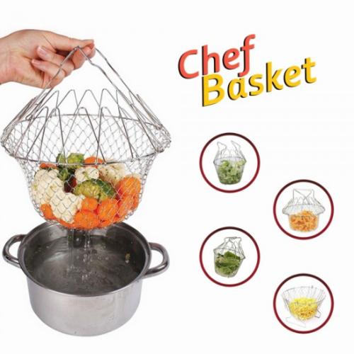 "Chef Basket" is a universal folding, multi-functional basket. It is convenient to lower the prepared food into a pan (for example, pasta, vegetables, etc.), wash it under running water, cook for a couple or use it as a basket. When the food is ready, simply remove the "Chef Basket" from the pan, keep it under running water, or place it on a dish. "Chef Basket" has a flexible structure, it grows and contracts easily.