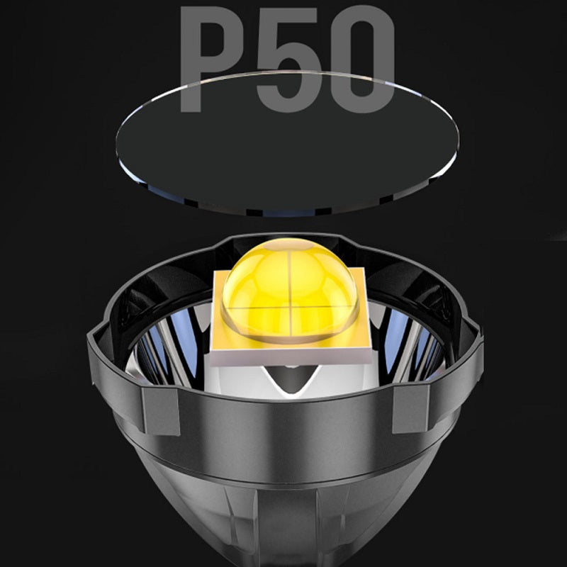 -This flashlight adopts he latest P50 LED strong light lens with large irradiation area