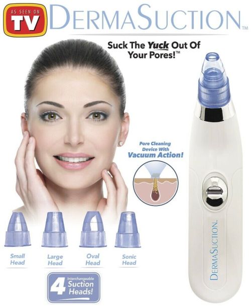 Grossed out by your clogged pores Looking for a better way of how to get rid of blackheads DermaSuction effortlessly removes blackheads for a painless and easy blackhead removal. Squeezing damages delicate skin tissue. And so-called blackhead remover masks often fall short of their claims. DermaSuction is like a cordless vacuum for your face. It uses a powerful, yet gentle vacuum that extracts impurities and blackheads from your pores. With two different power settings, you choose the one thats right for you. DermaSuction has 4 interchangeable suction heads for the perfect extraction. Reveal your beautiful skin! When youre done, simply rinse the dirty suction head under water. Dont stop at your face use DermaSuction to remove impurities from all over your body. Get DermaSuction and suck the yuck out of your pores!