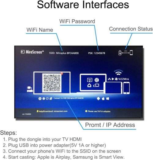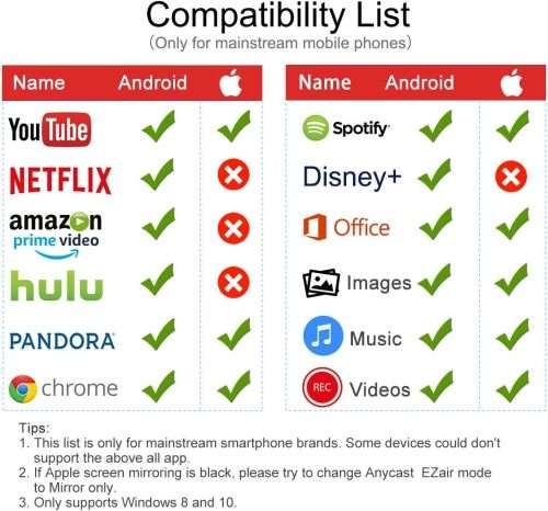- [Please check before purchasing] This WIFI display dongle supports Miracast, DLNA, and Airplay. But please check your equipment flow requirements. 1. Does your TV support HDMI port? 2. Does your iPhone/iPad support iOS 8+ and Android version 4.4+, Mac 10.8 or higher and Windows 8.1 or higher? 3. Whether the mobile phone system has a mirroring function, such as "screen mirroring" of Apple mobile phones, "smart view" of Samsung mobile phones... (Android mobile phone users, please confirm whether the mobile phone