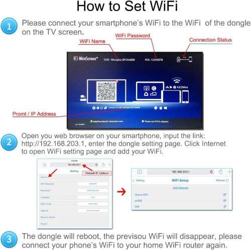- Simple Operation, No Switching RequiredNo app or software driver required. No need to switch between Airplay and Miracast, automatic switching, super easy. Just 3 steps, you can easily enjoy music, videos, photos, office files and websites on the big screen: Plug and Play->Connect->Mirror.