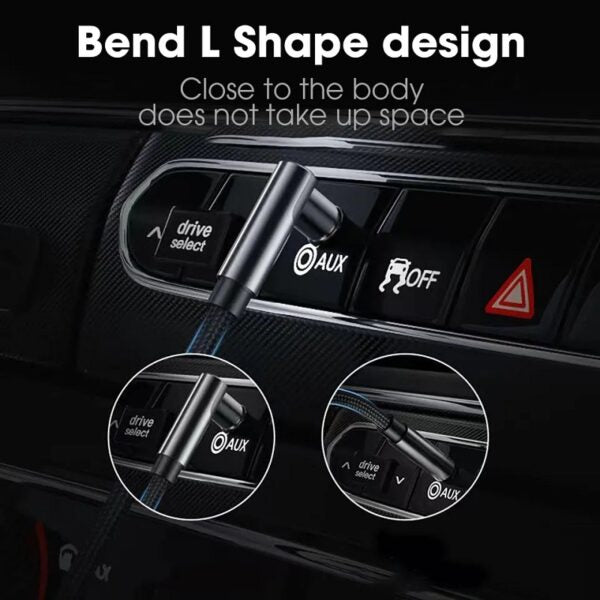 -90 degree ends that keep the cable close to the equipment, preventing the aux cable from being unplugged while moving items around my work space
